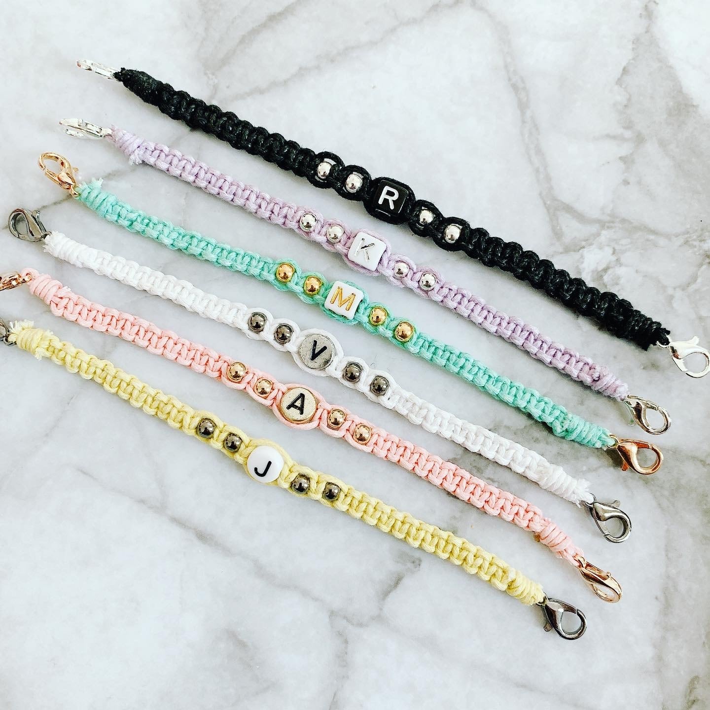 ワックスコードで編んだミサンガに、アルファベットビーズでイニシャルを入れました