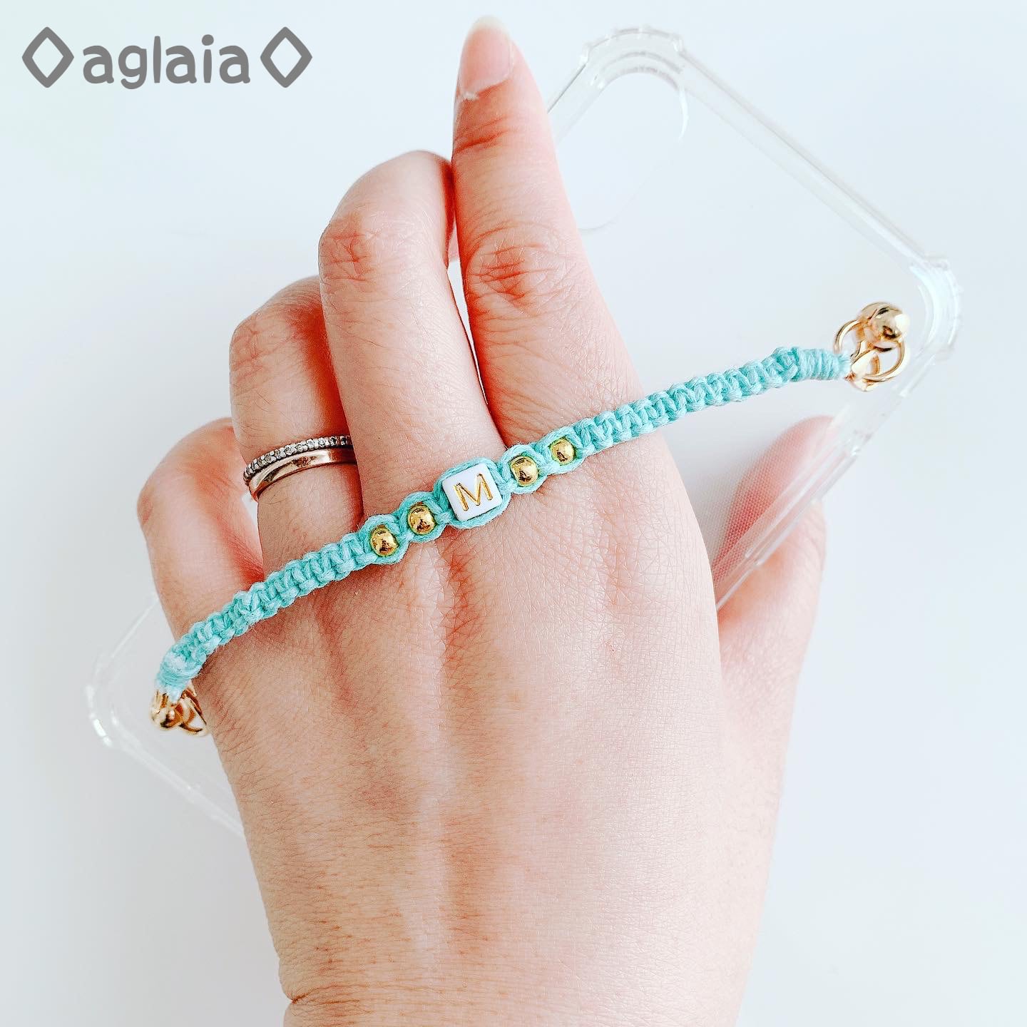 中央にアルファベットビーズを1つ、サイドに小さなビーズを編み込み、両サイドにはカニカンを付けてあります