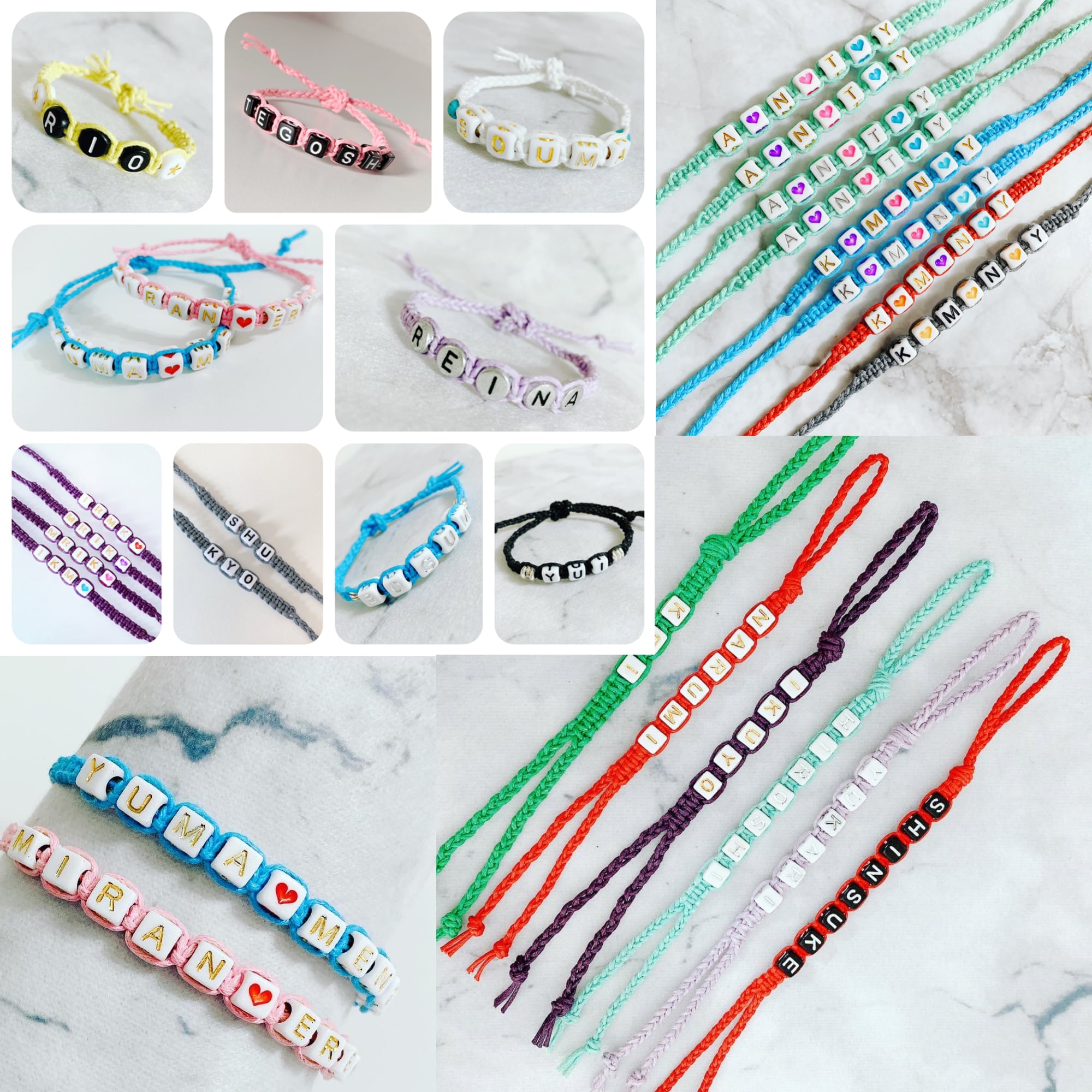 ワックスコードで編んだミサンガに、アルファベットビーズでお好きな文字を入れられます